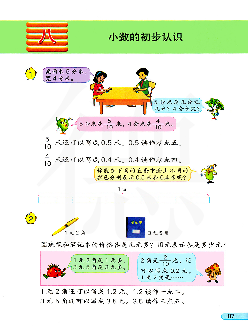 1.小数的意义:像0.3、0.8、12.4、13.5……这样的数叫做小数。
