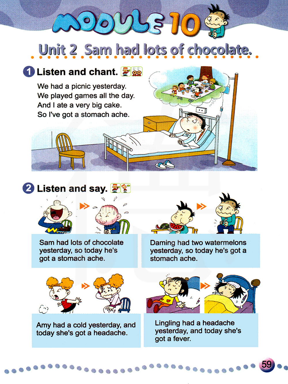 重点:Words and phrases: stomachache, cold, headache, fever,