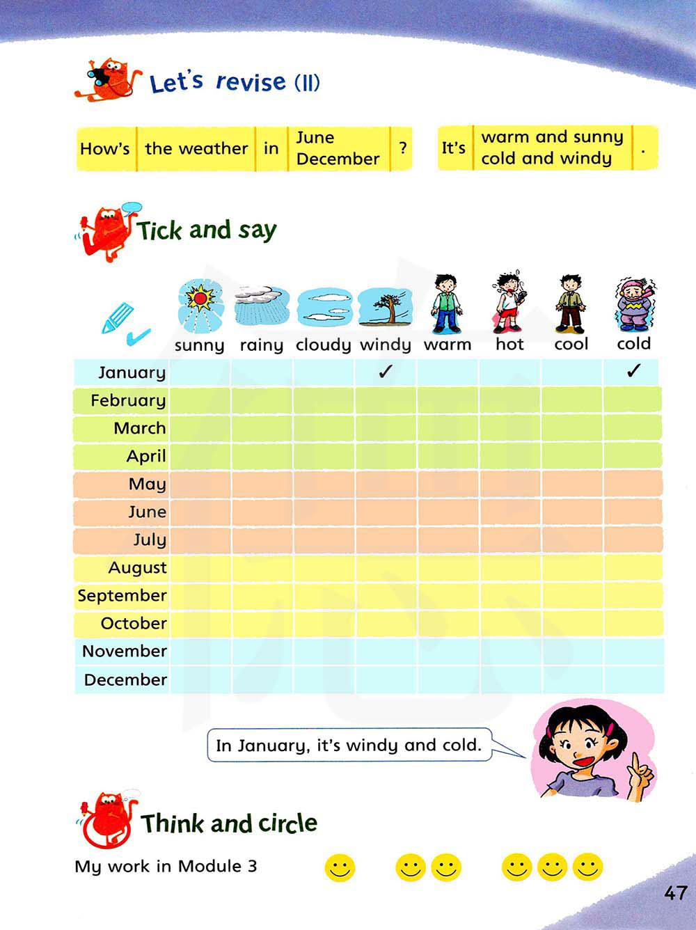 天气暖和晴朗。 天气寒冷多风。