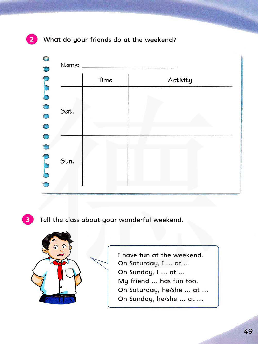 周末我玩得开心。星期六,我在……星期天,我在…… 我的朋友……也玩的开心。星期六,他/她在……
