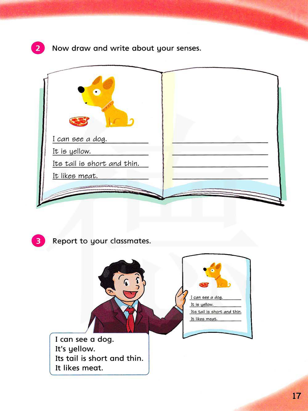 我能看见一只狗。他是黄色的。它的尾巴又短又薄。他喜欢肉。