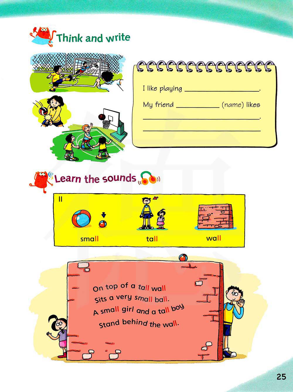 在高高的墙顶,有一个小小的球。墙的背后站着一个小女孩和一个小男孩。