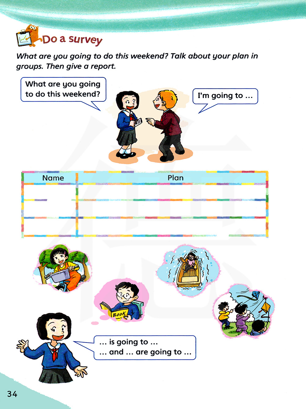 这个周末你将做什么? 分组讨论你的计划。然后给出一个报告。
