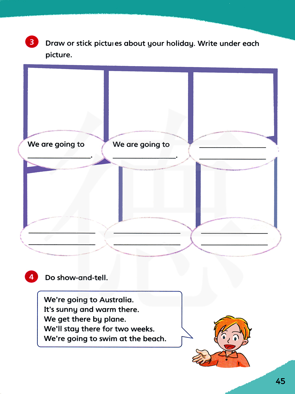 画或粘贴关于你的假期的图片。在每幅图片下面写一写。