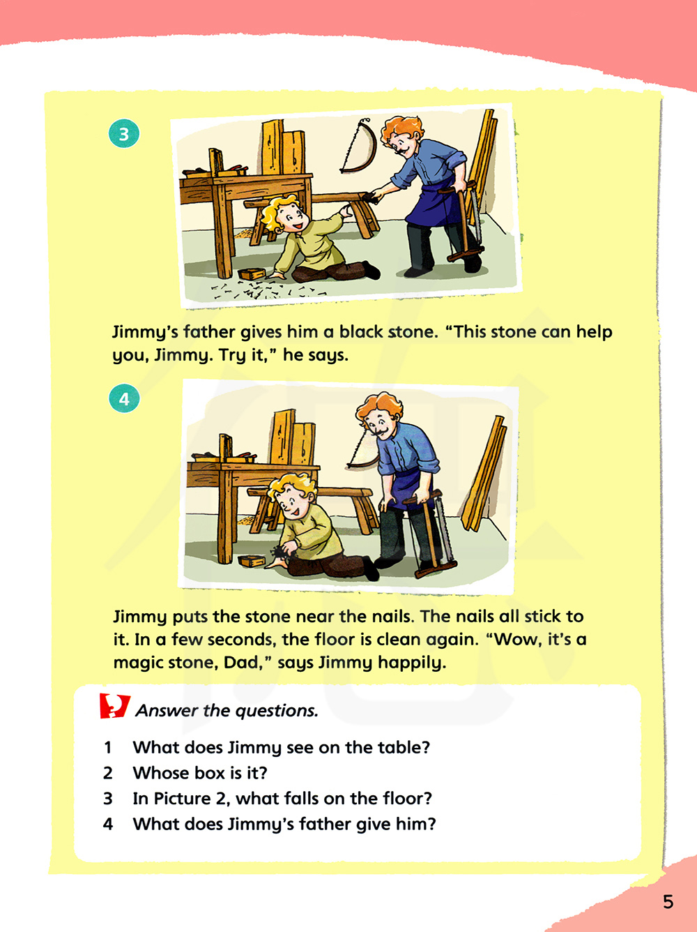 吉米的爸爸给他一块黑色的石头。“这个石头能帮助你,吉米。试一试,”他说。