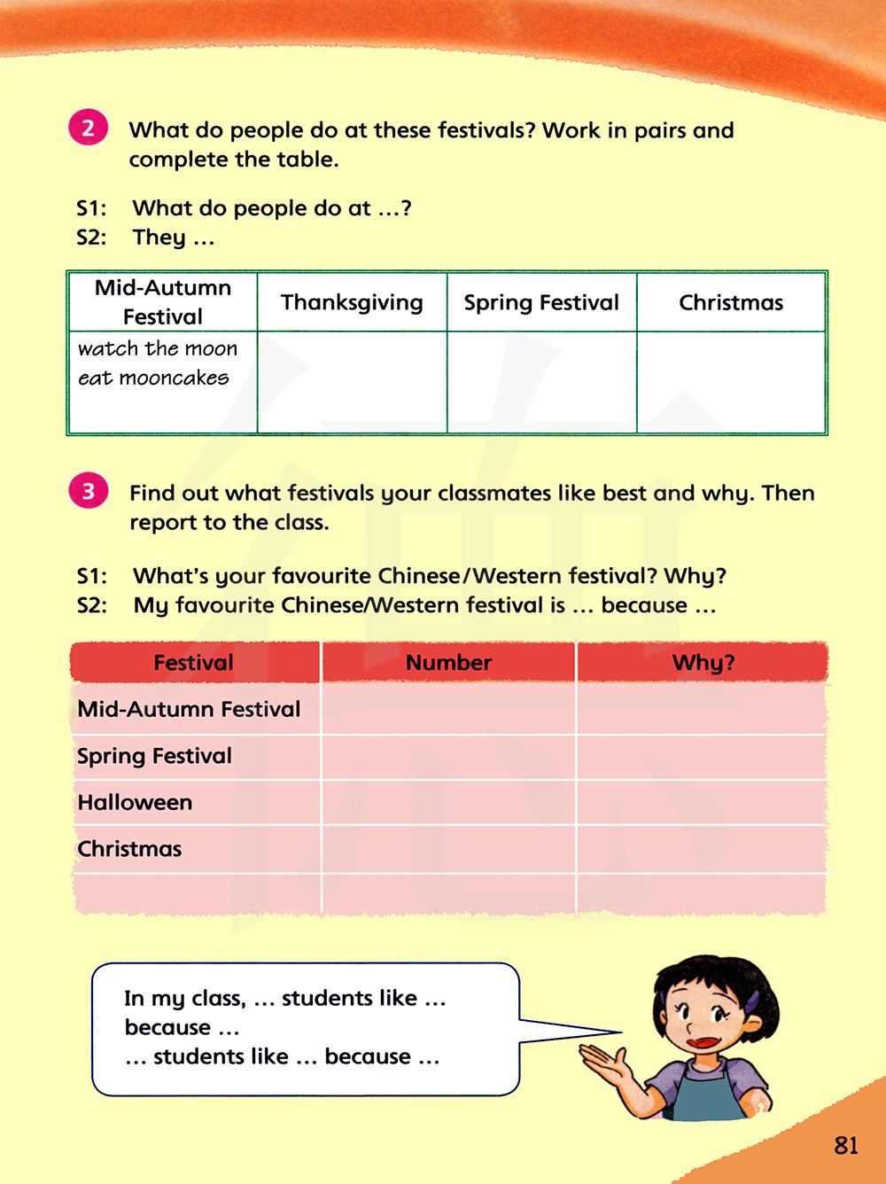 找出你的同学最喜欢的节日以及为什么。然后向全班同学汇报。