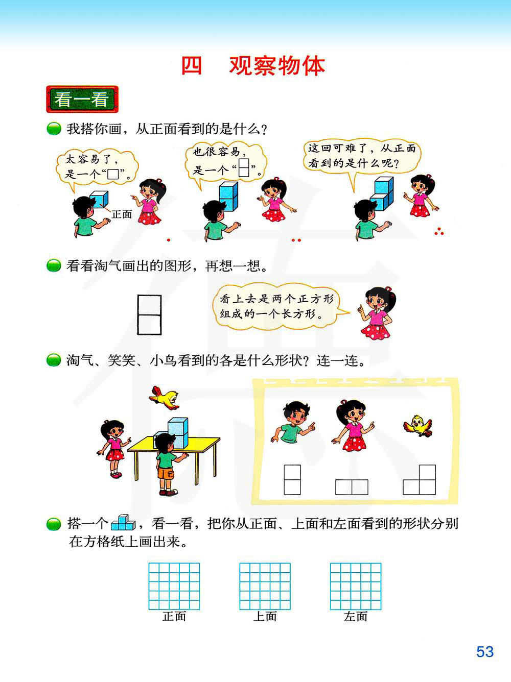 1、从不同位置观察同一个物体,所看到的图形有可能一样,也有可能不一样。