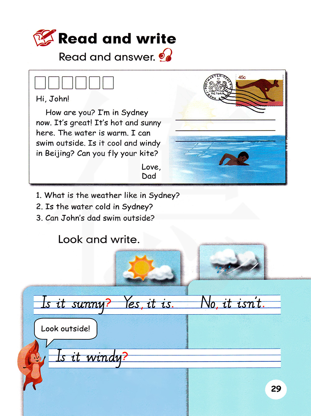 水很暖和。我能在外面游泳。北京又凉爽又多风吗?你会放风筝吗?