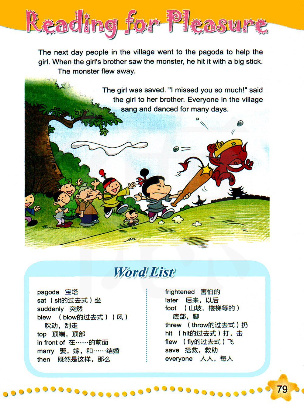 女孩得救了。“我非常想念你!”女孩她对哥哥说。村子里的所有人又唱又跳了许多天。