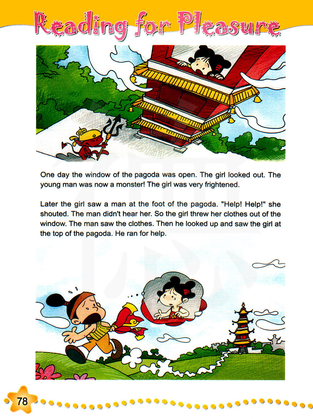 后来女孩看到宝塔底部有一个人。“救命,救命”她喊道。这个人没有听到她喊。所以女孩把她的衣服从窗户扔了出去。这个人看见了衣服。然后他向上看去,并看到了塔顶的女孩。他跑去寻找帮助。