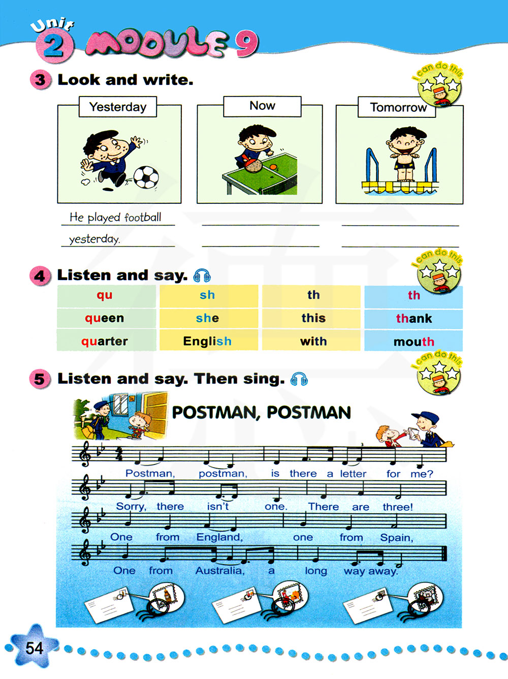 邮递员,邮递员,有一封给我的信吗?抱歉,还是一封。有三封!一封来自美国,一封来自西班牙,一封来自很远的澳大利亚。