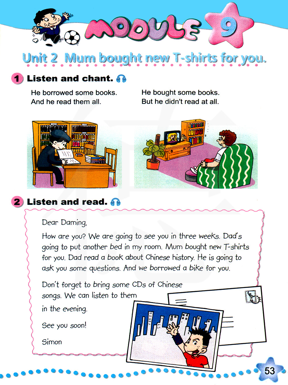 2、能口头运用:We are going to see you in three weeks. Mum bought new chopsticks for you. He’s eating an apple now.来说明过去、现在、将来的事情。