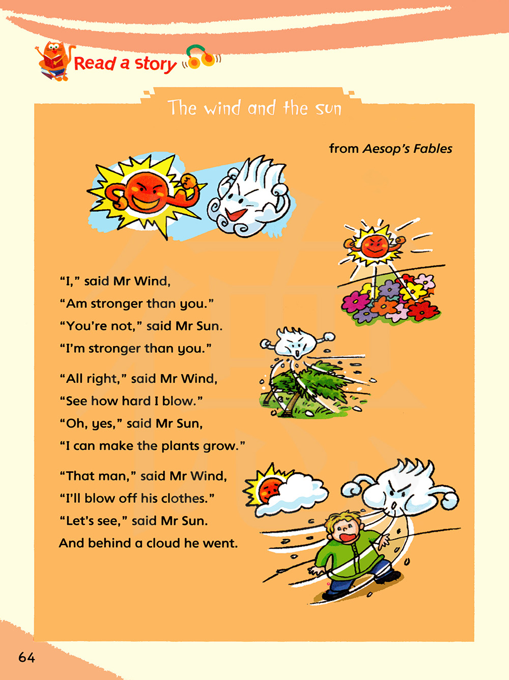“我,”风先生说道,“比你更强大。”“你不是,”太阳先生说。“我比你更强大。”