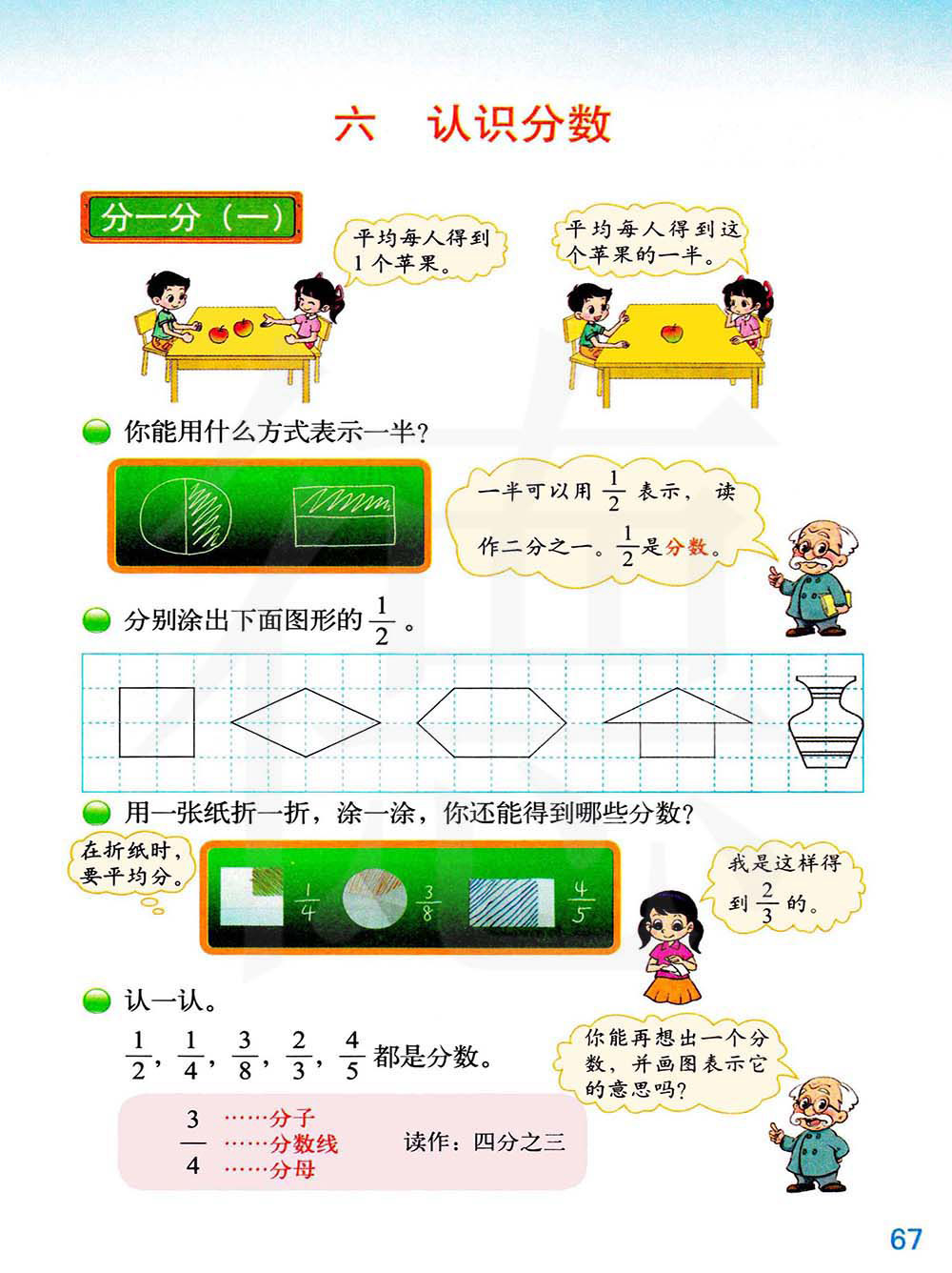 认识几分之几:把一个整体平均分成几份,取其中的几份,就是这个整体的几分之几。