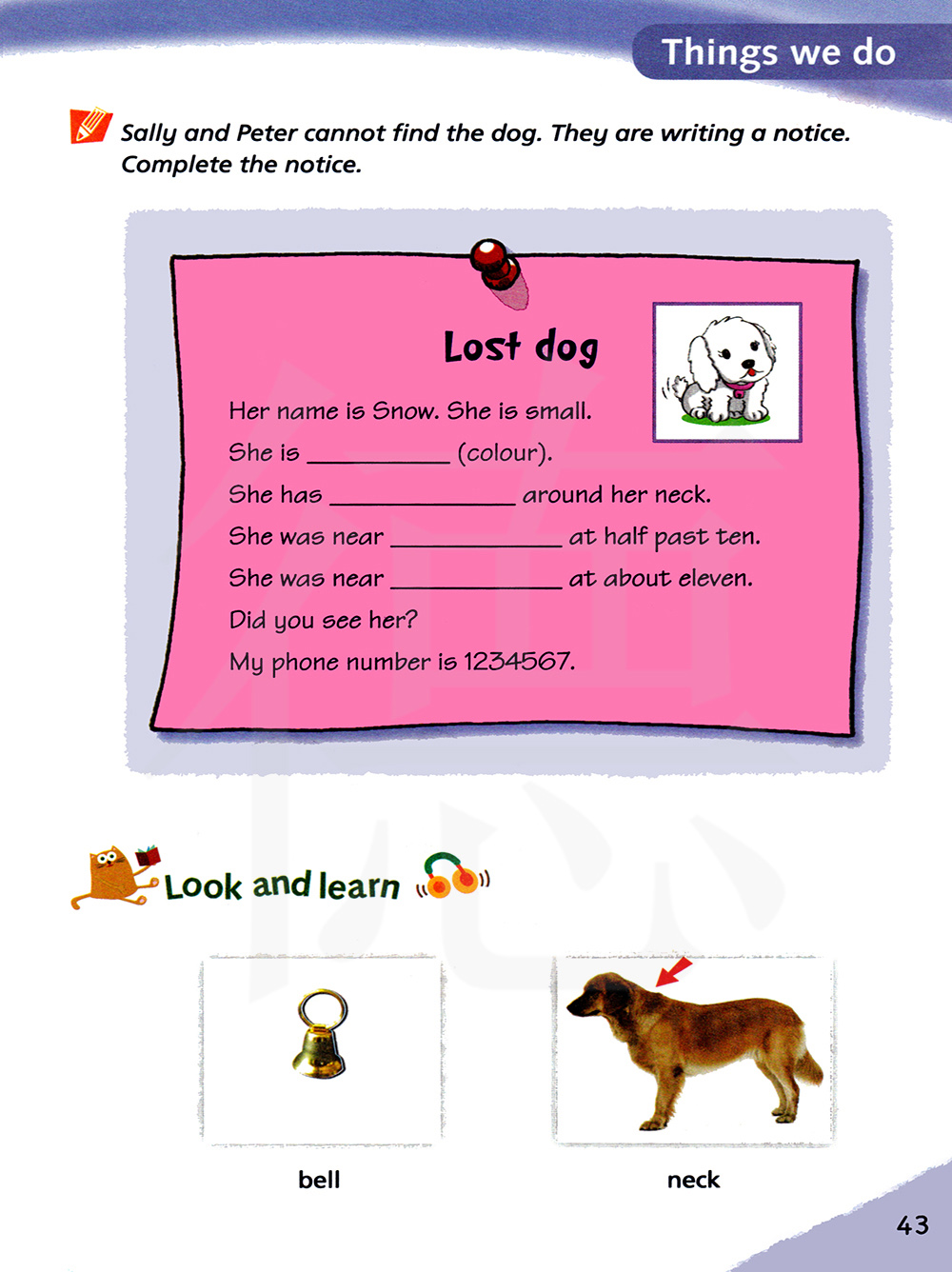 萨莉和彼得找不到狗。他们正在写一则通告。完成通告内容。