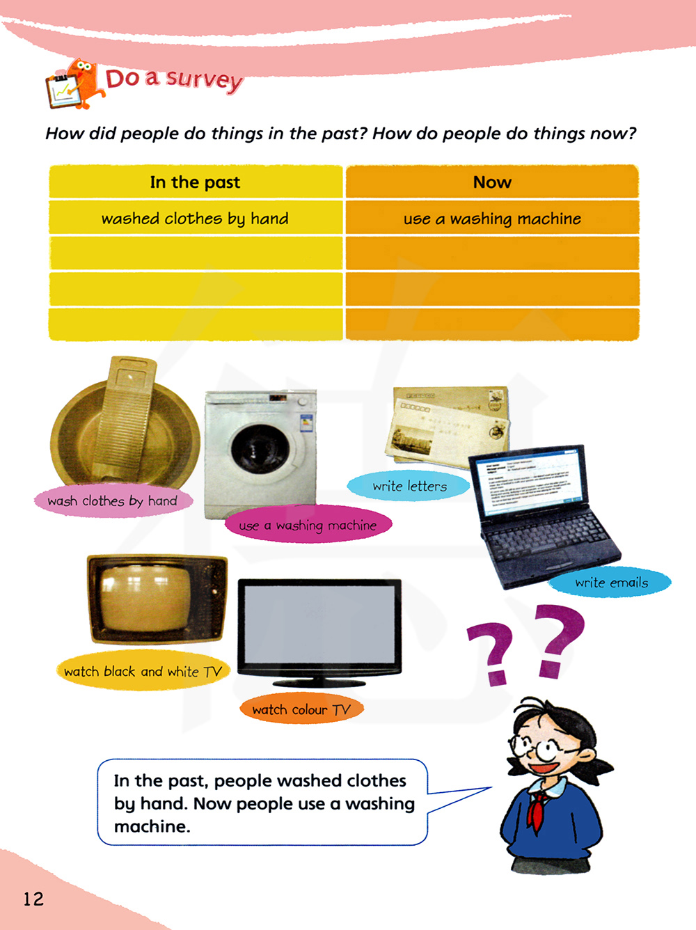 在过去,人们用手洗衣服。现在人们用洗衣机。