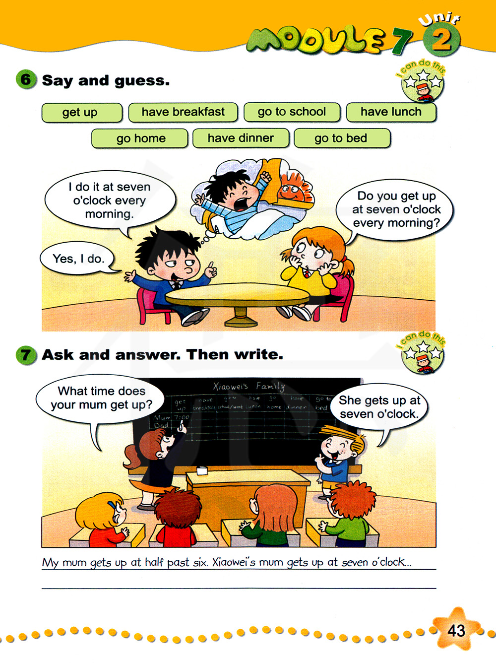 我妈妈六点半起床。小伟的妈妈七点起床···