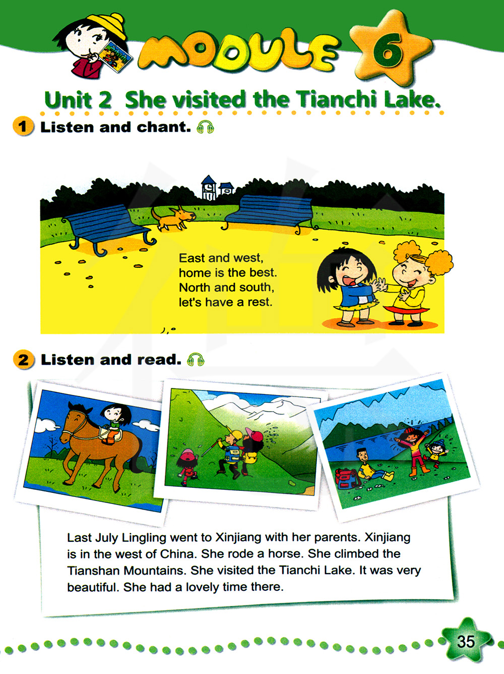 2、掌握句型:She visited the Tianchi Lake. It’s in the west west of China.描述过去的事情和位置。