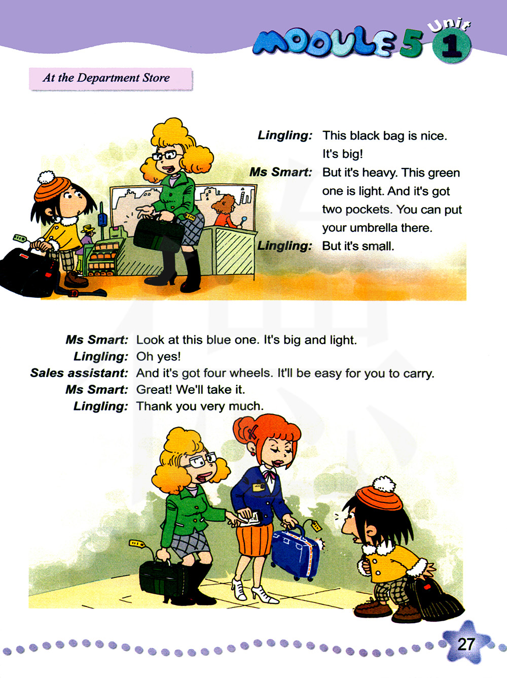 看看这个蓝色的。它又大又轻。哦是的!并且它有四个轮子。它很便于你携带。太棒了!我们就买它了。非常感谢你。