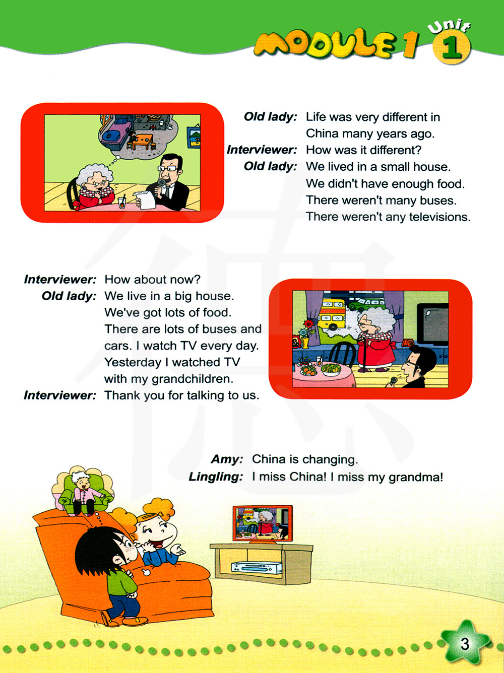 现在怎么样呢?我们住在一所大房子里。我们有许多事物。有许多的公共汽车和小汽车。我每天都看电视。昨天我和我的孙子一起看了电视。谢谢你和我们谈话。