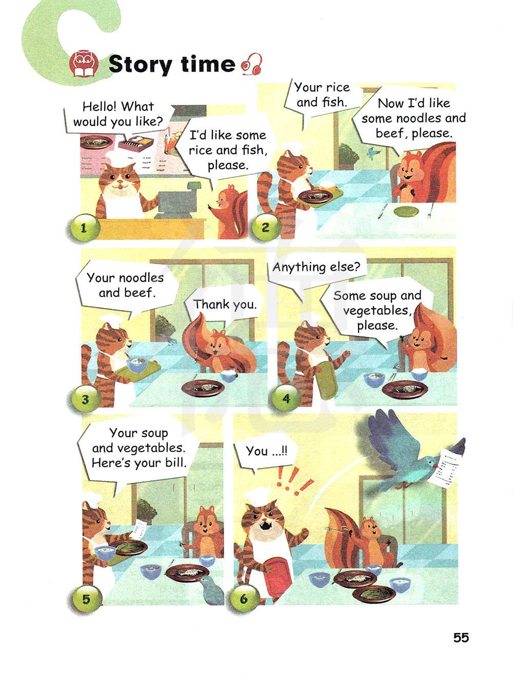 你的汤和蔬菜。这是你的账单。