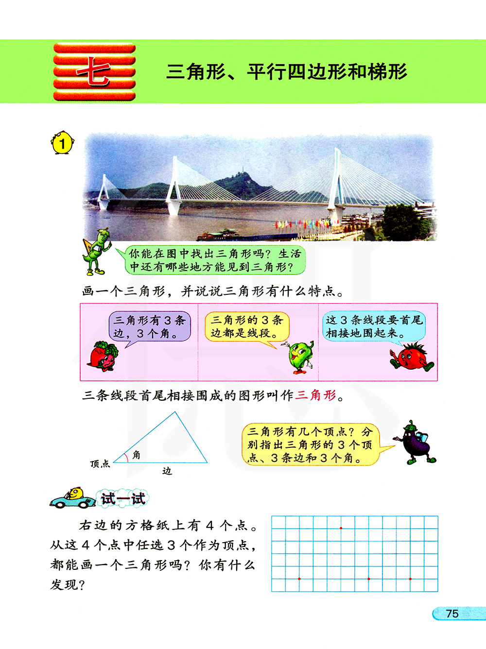 5、三角形具有稳定性(也就是当一个三角形的三条边的长度确定后,这个三角形的形状和大小都不会改变),生活中很多物体利用了这样的特性。如:人字梁、斜拉桥、自行车车架。