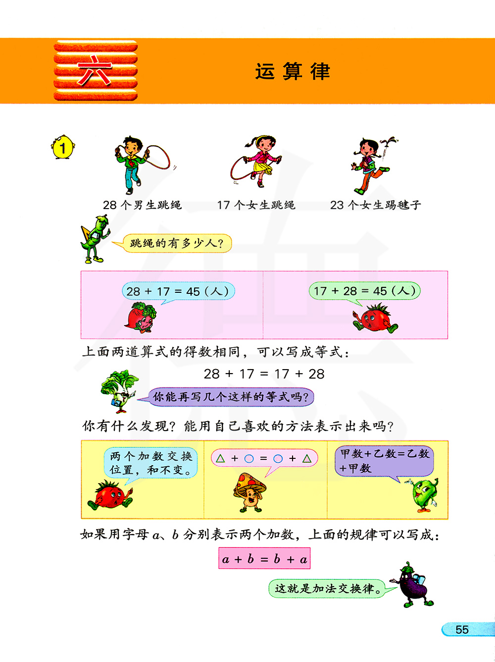 用字母表示为: a+b=b+a 如:1+2=2+1 1+2+3=2+3+1