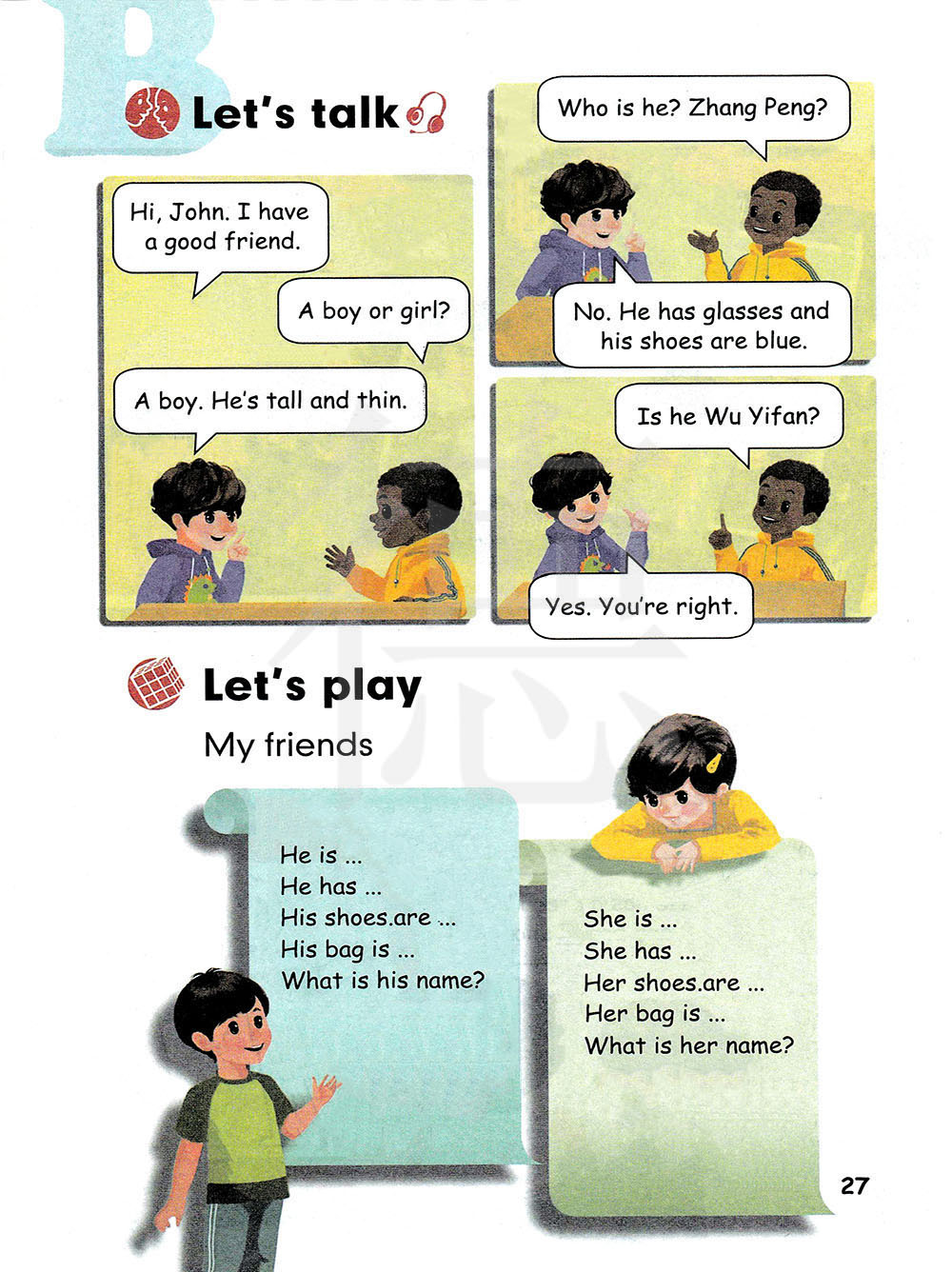 他是…他有…他的鞋子是…他的书包是…他叫什么名字…