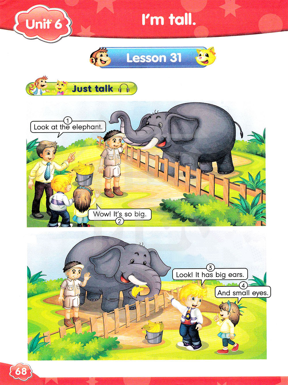 1. Look at the elephant. 看大象。 2. It has big ears. 它有大耳朵。 3. I have a rabbit. 我有一只兔子。