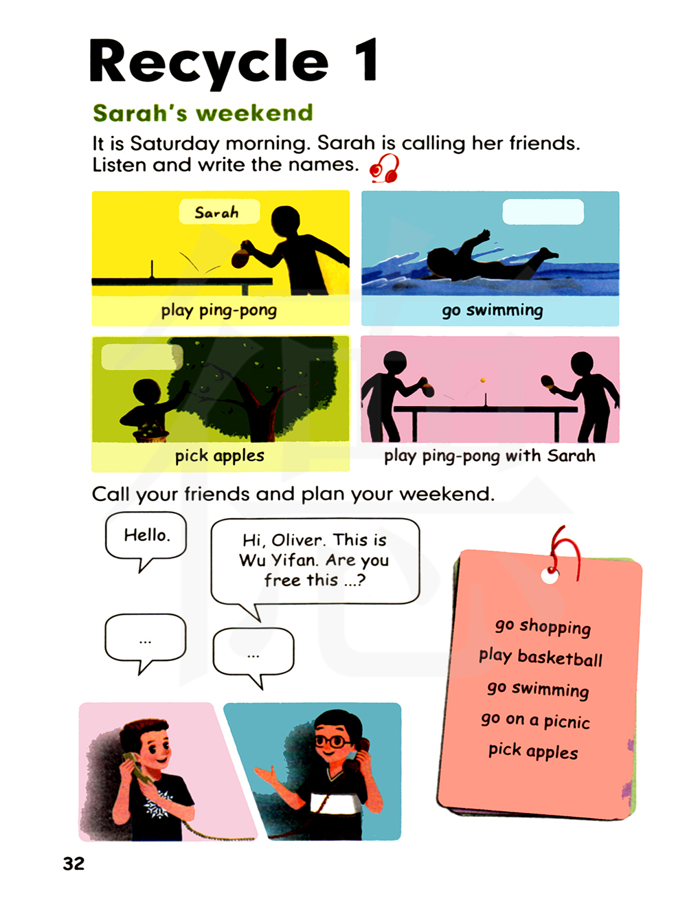 星期六早上。莎拉在给她的朋友们打电话,听一听并写出名字。