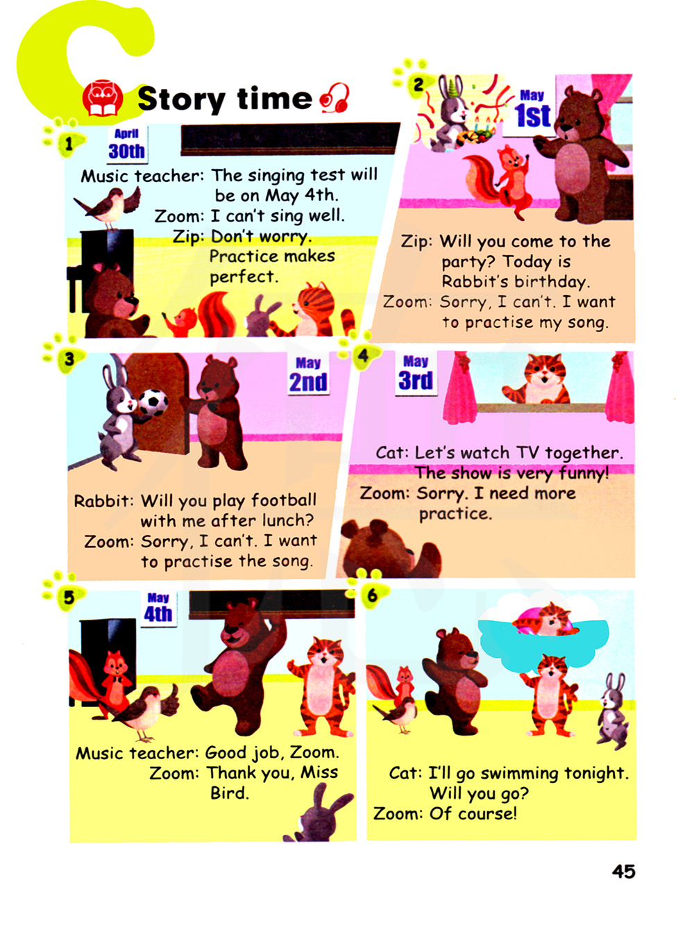 五月一日 你要来聚会吗?今天是兔子的生日。 对不起,我不能。我想练习我的歌曲。