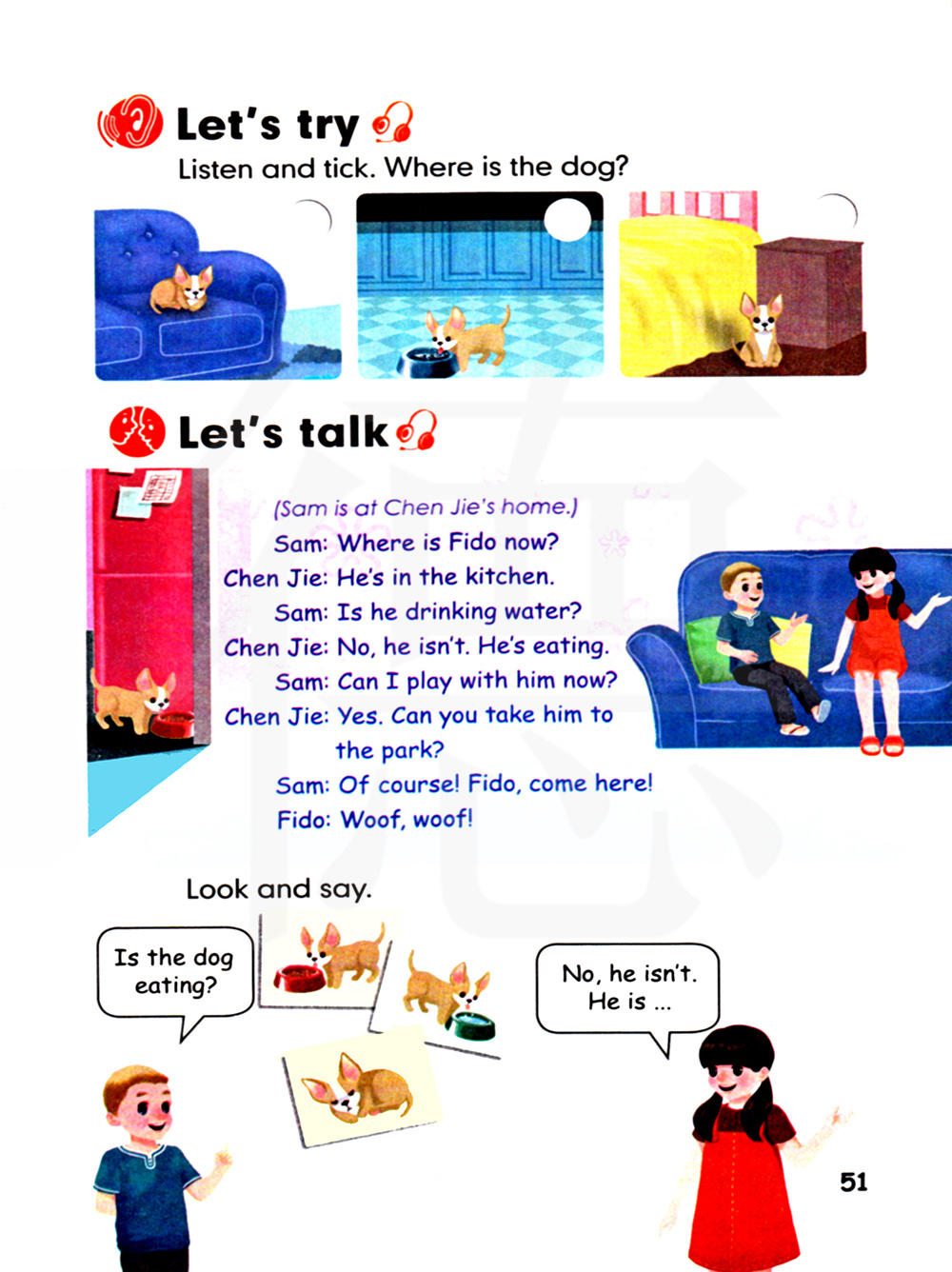 不,他没有。他在吃东西。 我现在可以和他玩吗?