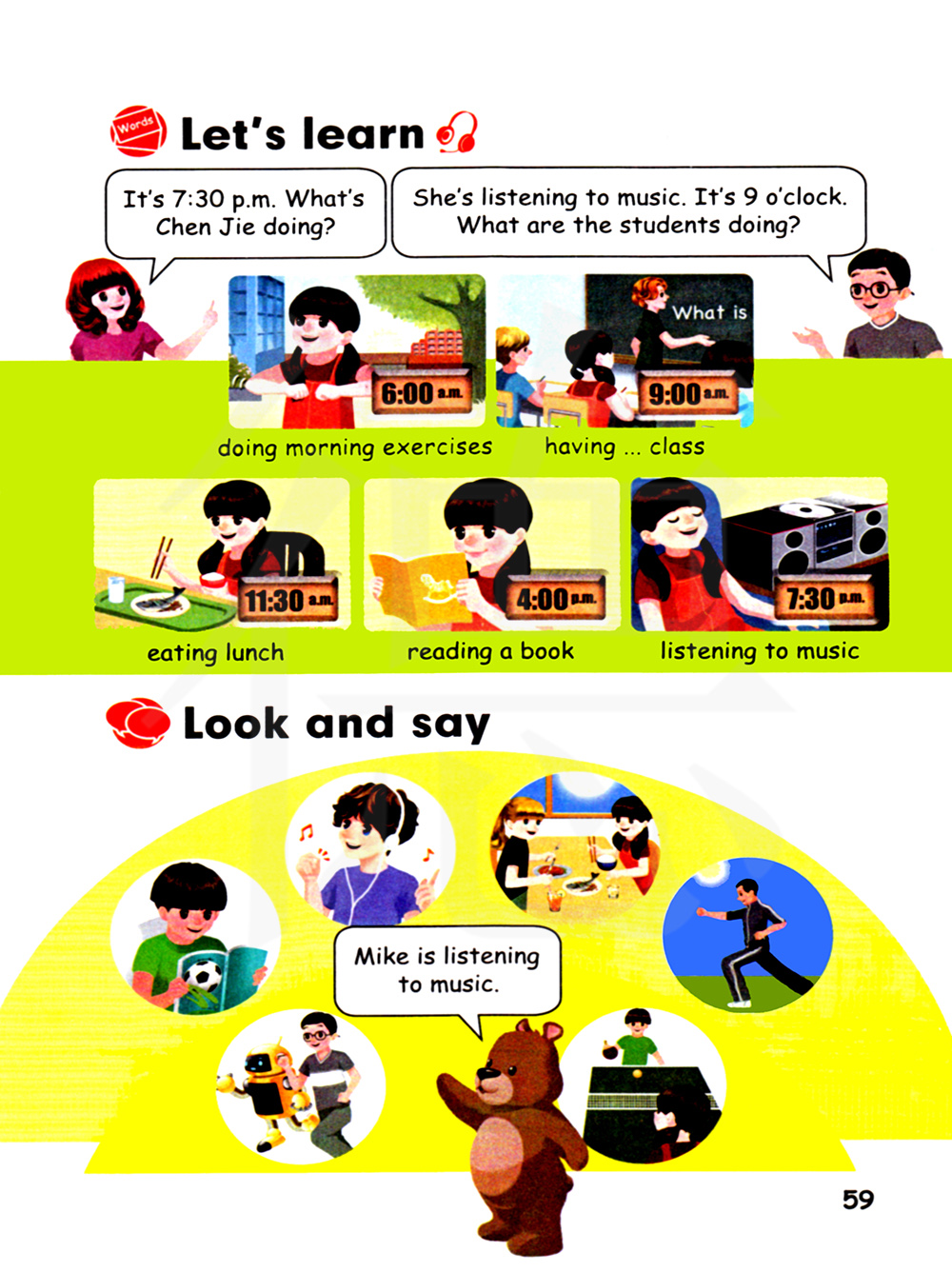 她在听音乐。九点。学生们在做什么?