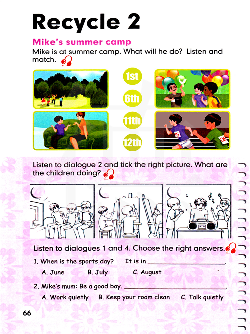 迈克在夏令营里。他会做什么呢?听一听并连一连。