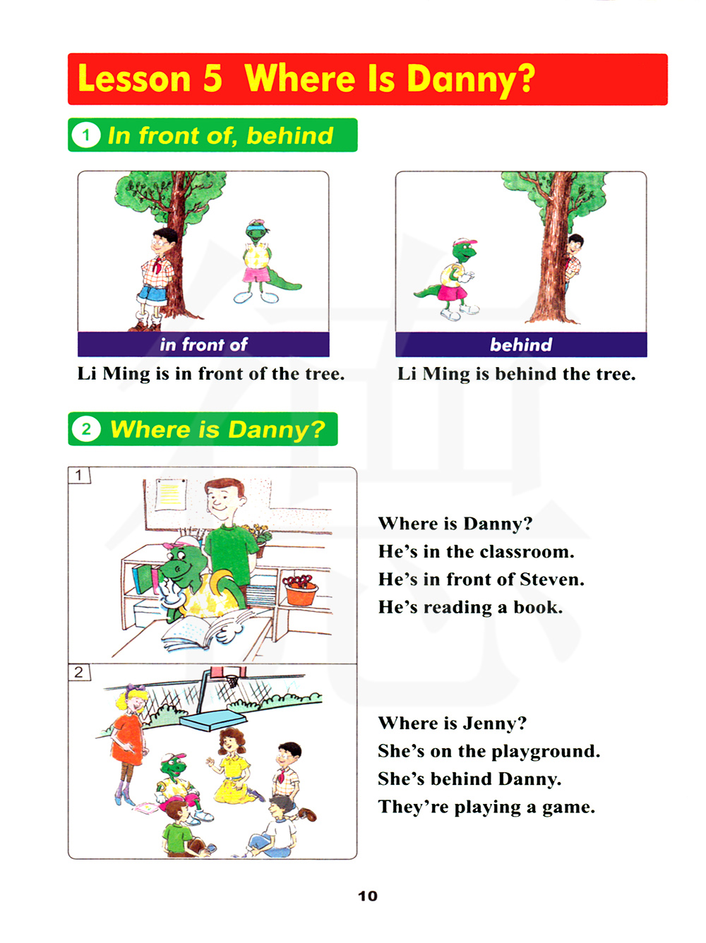 丹尼在哪里?他在教室里。 他在史蒂文前面。他正在看一本书。