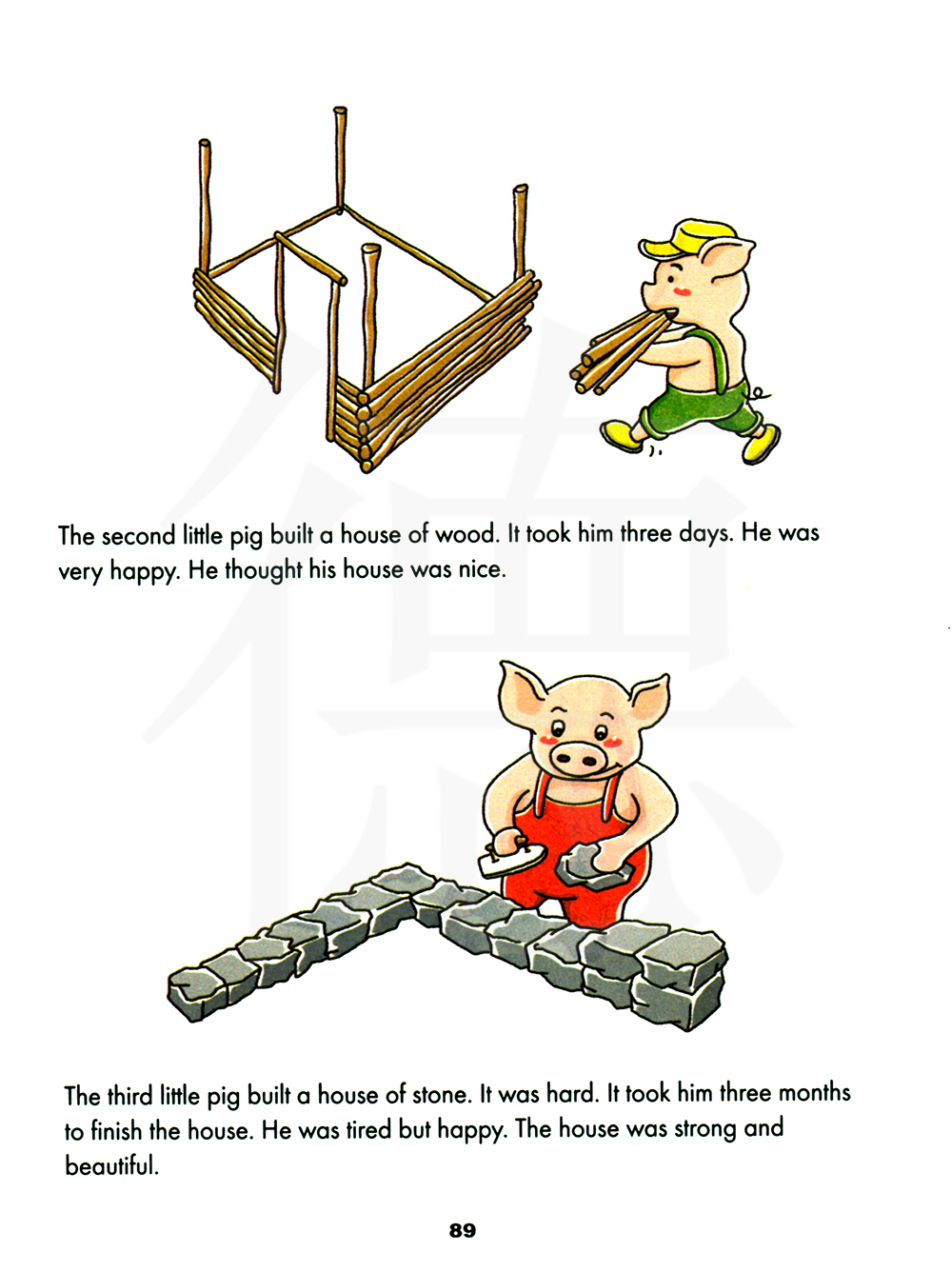 第二只小猪建了一间木头房。这间房子花了他三天时间。他非常开心。他觉得他的房子很漂亮。