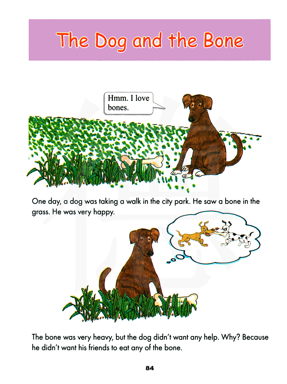 一天,一条狗在城市的公园里散步。他看见草丛里有块骨头。他非常开心。