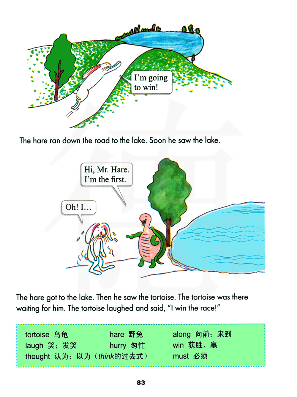 野兔到了湖边。然后看见了乌龟。乌龟在那里等他。乌龟笑着说,“我赢了比赛!”