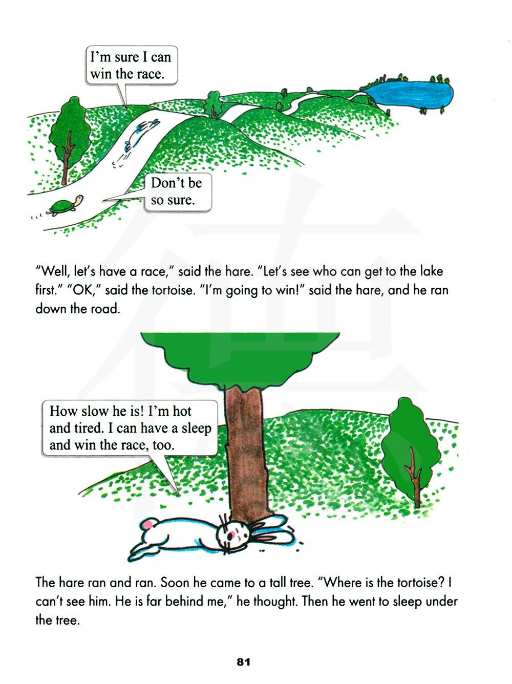 野兔跑啊跑。很快他到了一棵高树下。“乌龟在哪里?我看不见他。他在我很远的后面,”他想。然后他在树下睡了一觉。