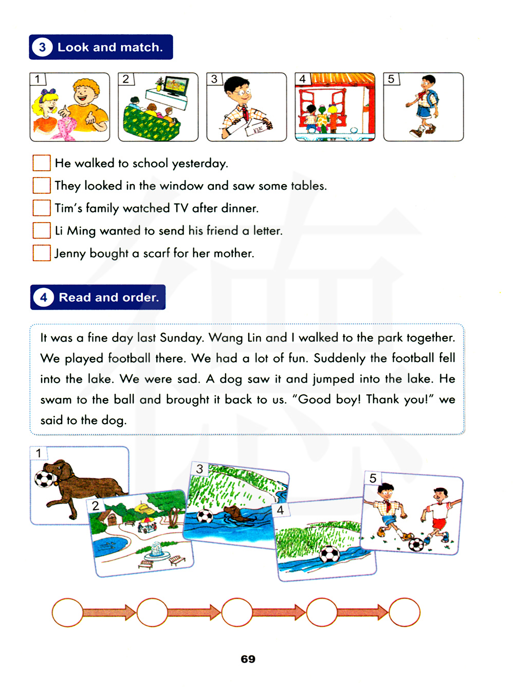 他昨天走路去了学校。 他们从窗户里望去并看到了一些桌子。 提姆的家人在晚饭后看了电视。 李明想给他的朋友寄封信。 詹尼给她的妈妈买了一条围巾。