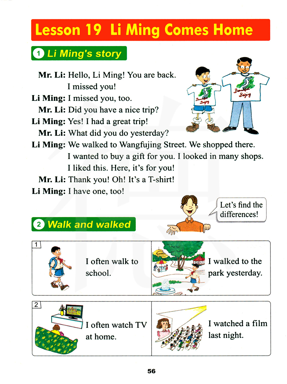 你们昨天做了什么? 我们走路去了王府井大街。我们在那里购物了。我想为你买个礼物。我看了许多家店。我喜欢这个。这里,这个是给你的! 谢谢!噢!是一件T恤! 我也有一件!