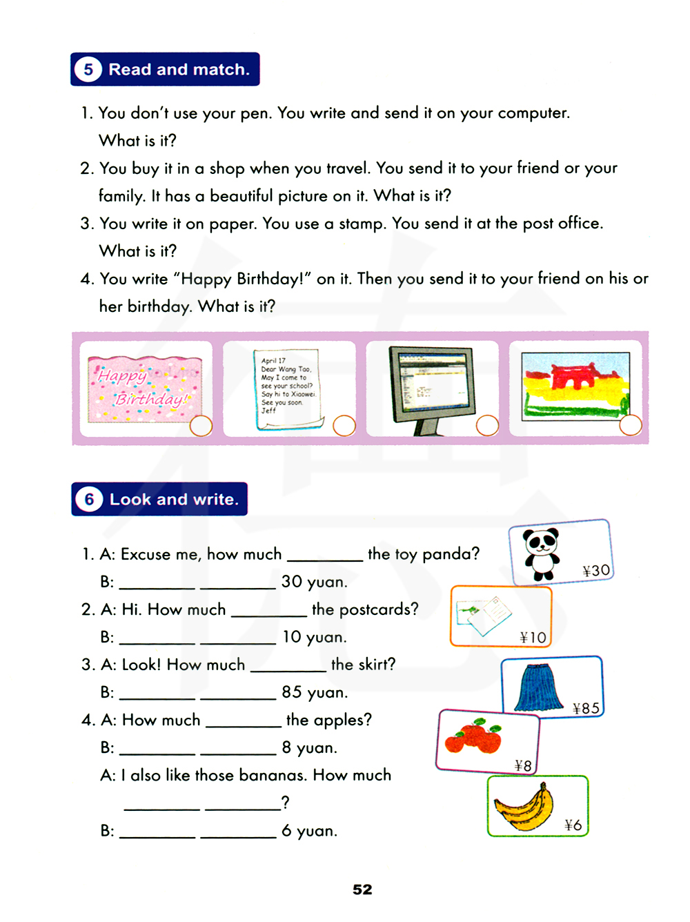 当你旅行时你在商店里买这个。你将它寄给那你的朋友或家人。它的上面有一幅漂亮的图片。它是什么? 你在纸上书写它。你使用一张邮票。你在邮局寄它。它是什么?