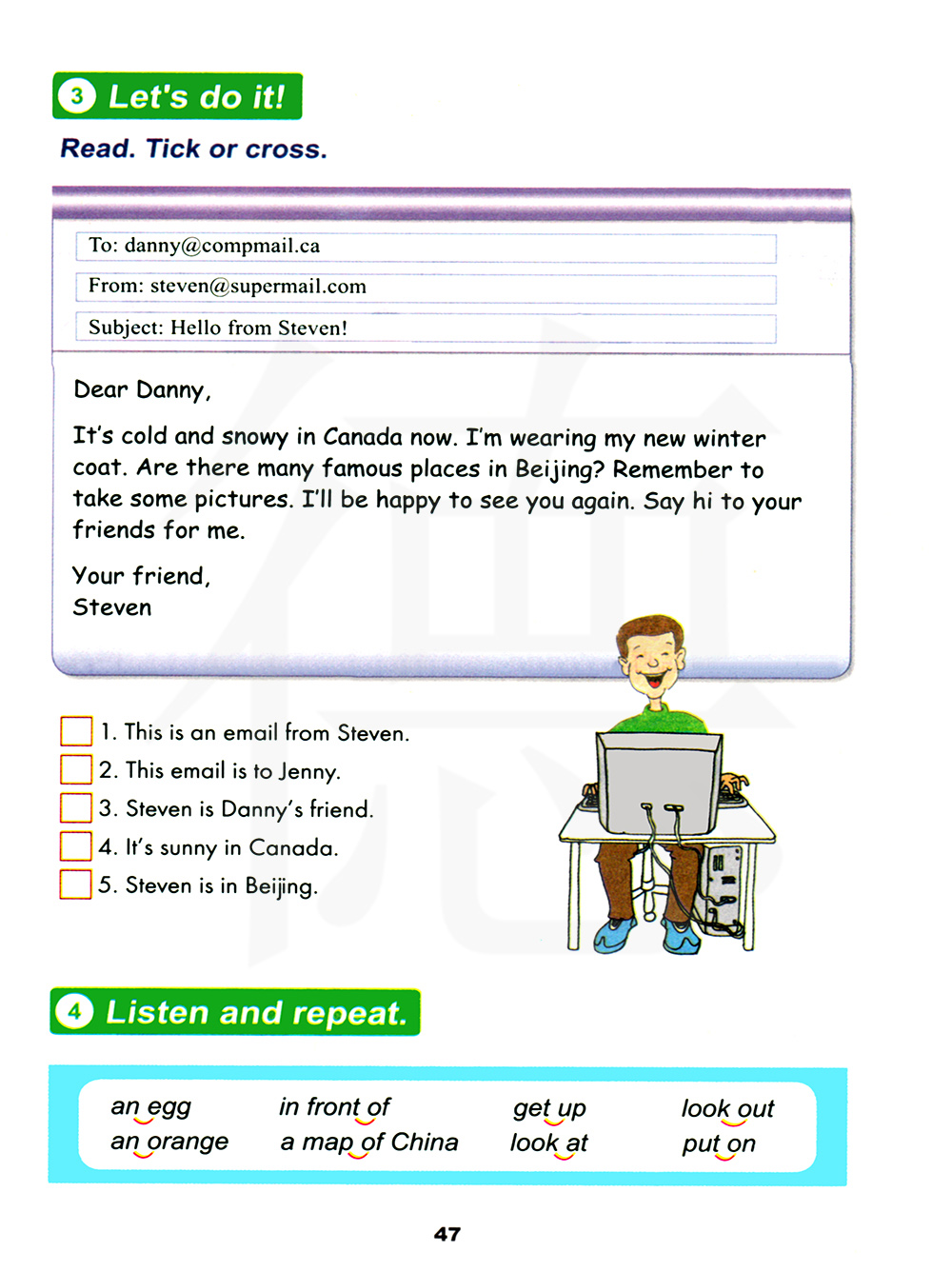 这是一封来自史蒂文的电子邮件。 这封邮件是发给詹尼的。 史蒂文是丹尼的朋友。 加拿大阳光明媚。 史蒂文在北京。