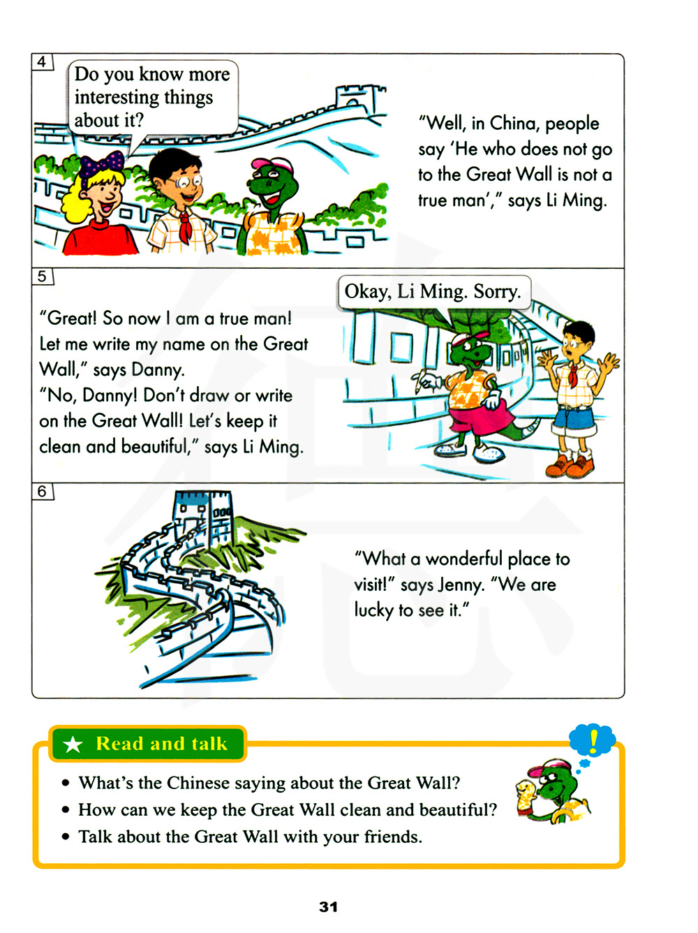 “太棒了!所以现在我是一个好汉了!让我在长城上写下我的名字,”丹尼说。“不,丹尼!不要在长城上乱涂乱画!让我们保持它的清洁和美丽吧,”李明说。