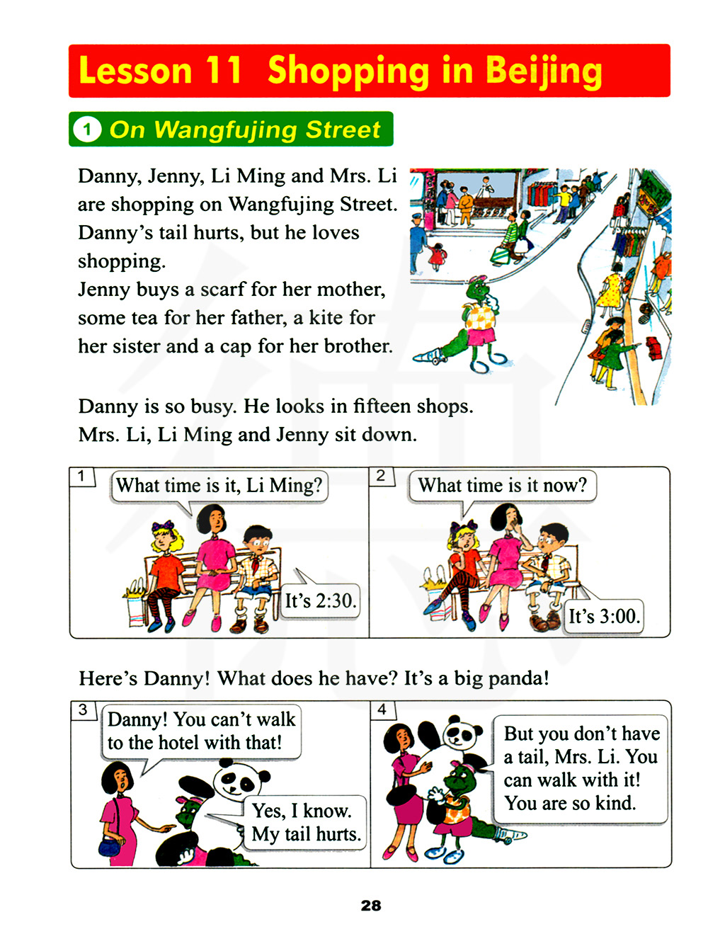 丹尼,詹尼,李明和李太太在王府井大街上购物。丹尼的尾巴受伤了,但是他喜欢购物。