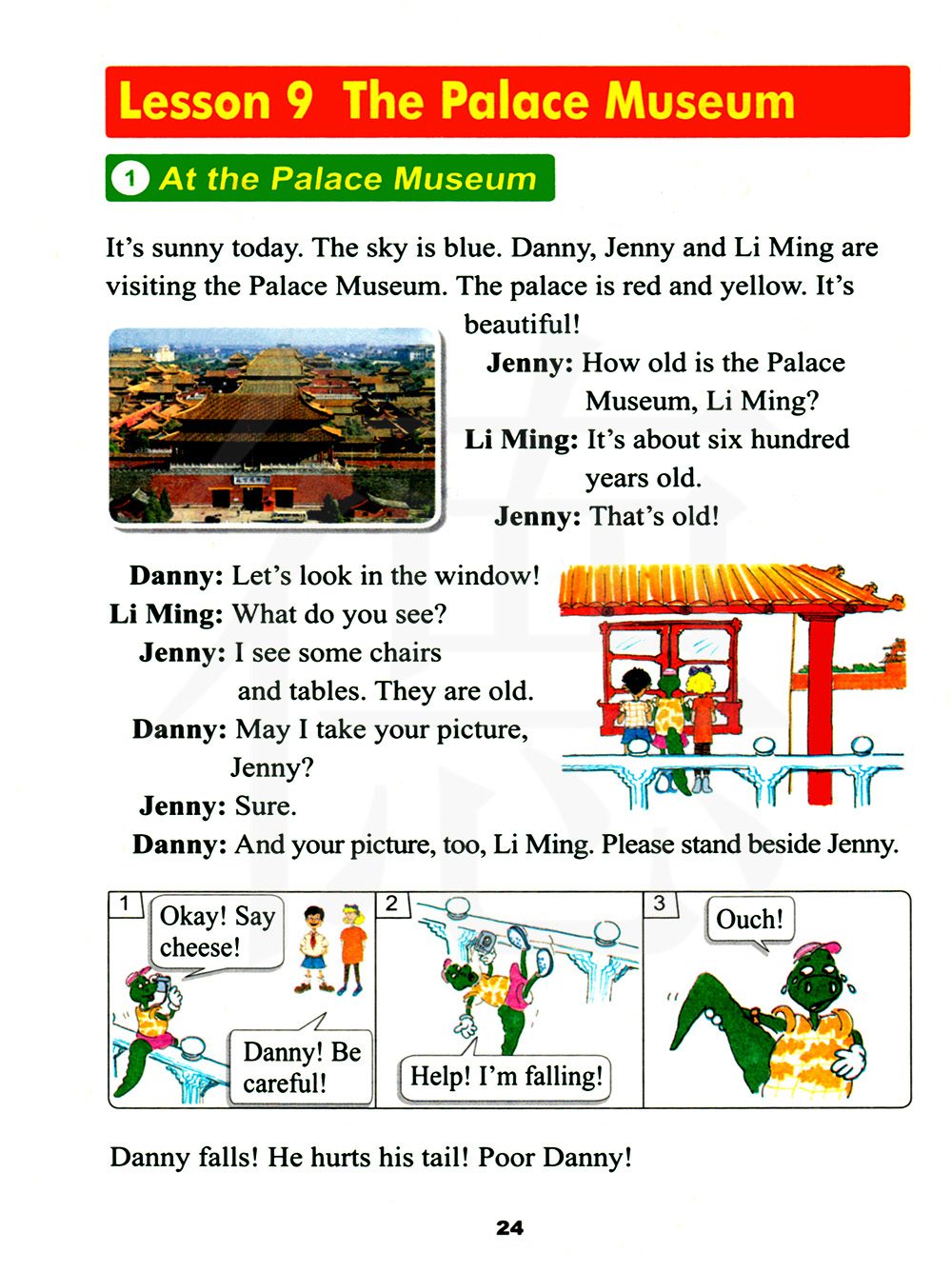 今天阳光明媚。天空很蓝。丹尼,詹尼和李明在参观故宫。宫殿是红色和黄色的。它很漂亮!
