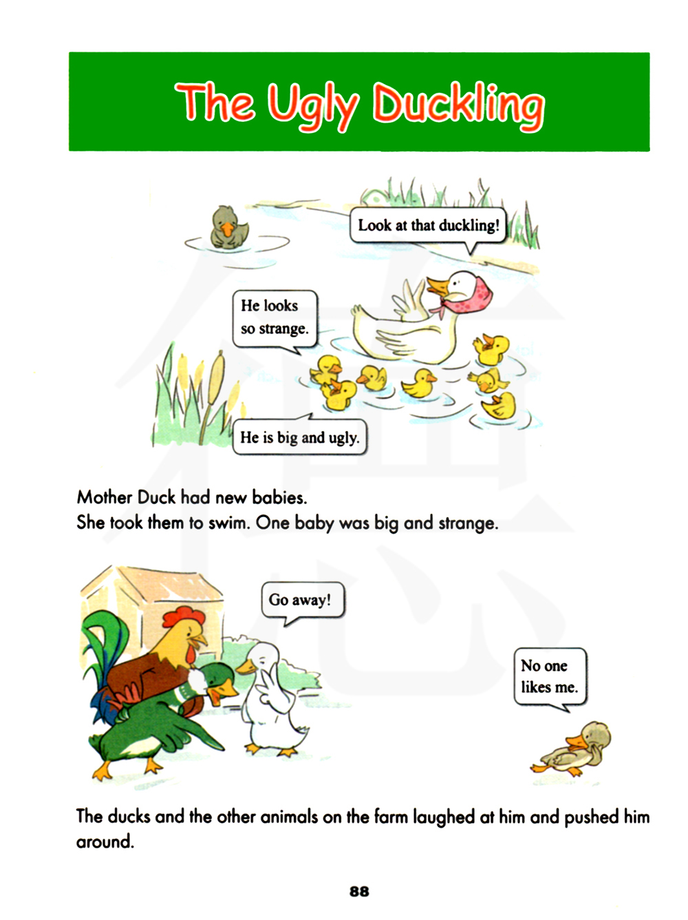 那些鸭子和农场里其他动物都嘲笑他并且把他推来推去。