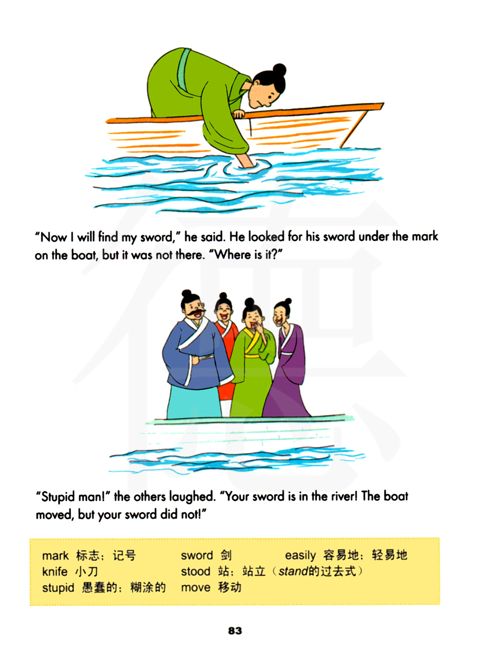 笨蛋!其他人大笑,你的剑在河里!船在走,但是你的剑没走!