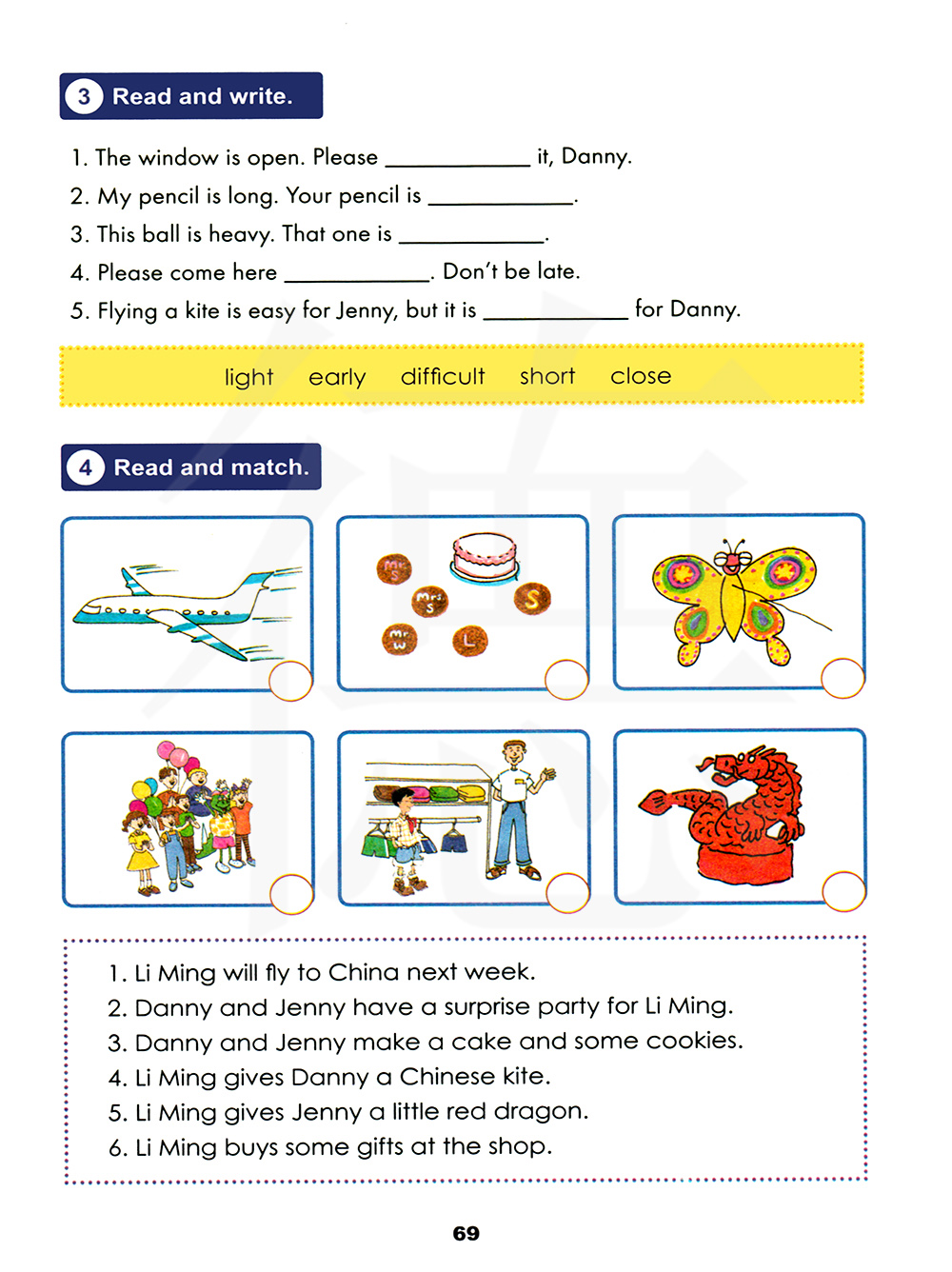 丹尼和詹妮做了一个蛋糕和一些曲奇饼。李明送给丹尼一只中国风筝。
