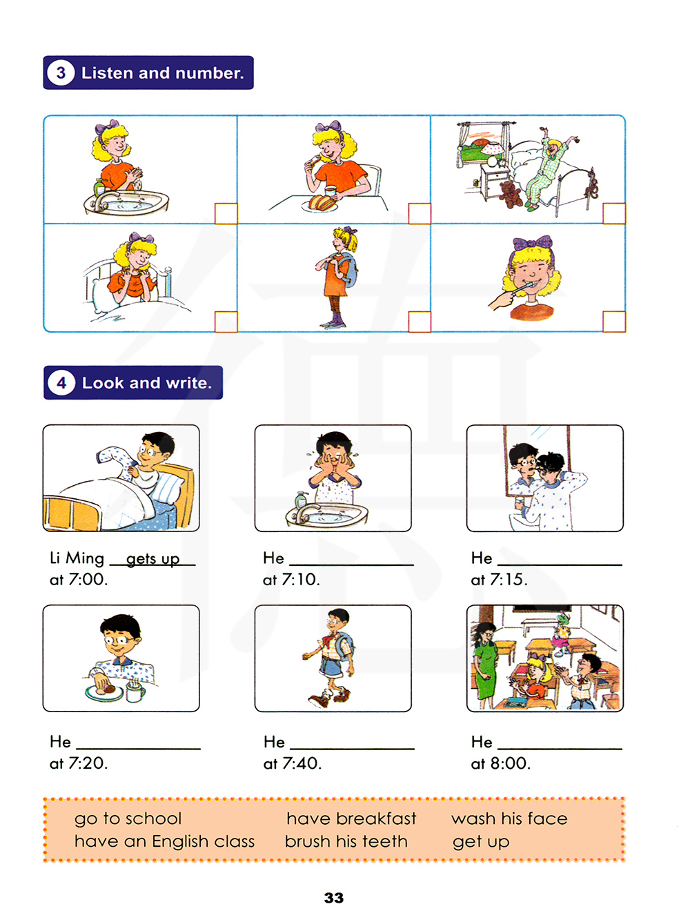 去上学 吃早餐 洗脸 上英语课 刷牙 起床